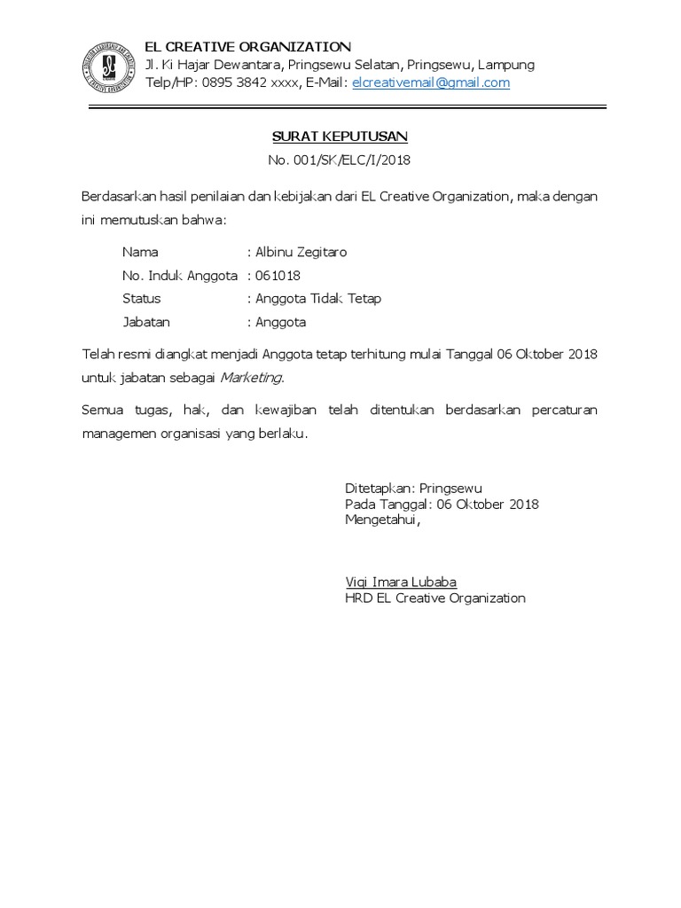 Contoh Surat Keputusan Pengangkatan Karyawan Kontrak Pdf